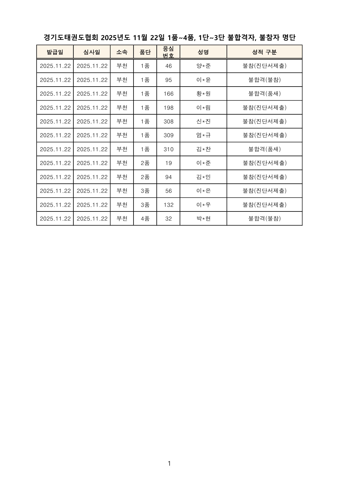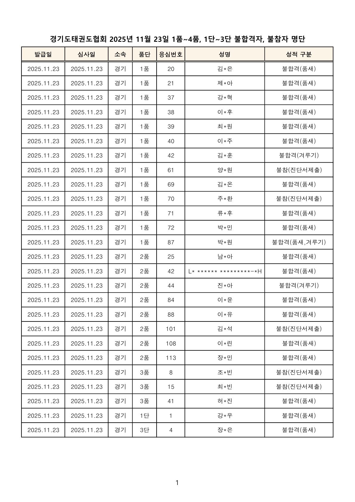 심사결과자료 요구서 작성방법 : 불합격 관련 자료요구 시 태권도심사규칙 제20조(심사결과자료의 요구 및 절차) ➀항에 의거 합격자공고일로부터 5일 이내에 심사결과자료요구서[별지서식1]를 제출하시면 ➁,➂항에 의거 절차대로 처리·답변을 받으실 수 있습니다. 심사결과자료요구서[별지서식1]은 [경기도태권 도협회 홈페이지 자료실-심사]에서 다운받으실 수 있습니다